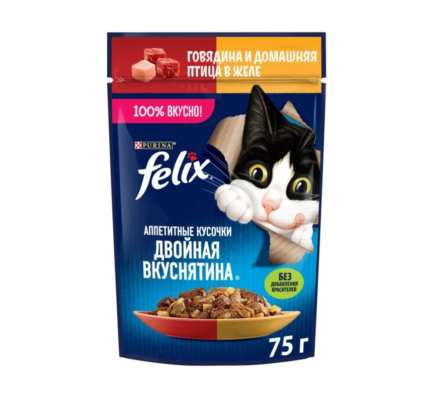 Felix аппетитные кусочки с говядиной и домашней птицей в желе, 75 г