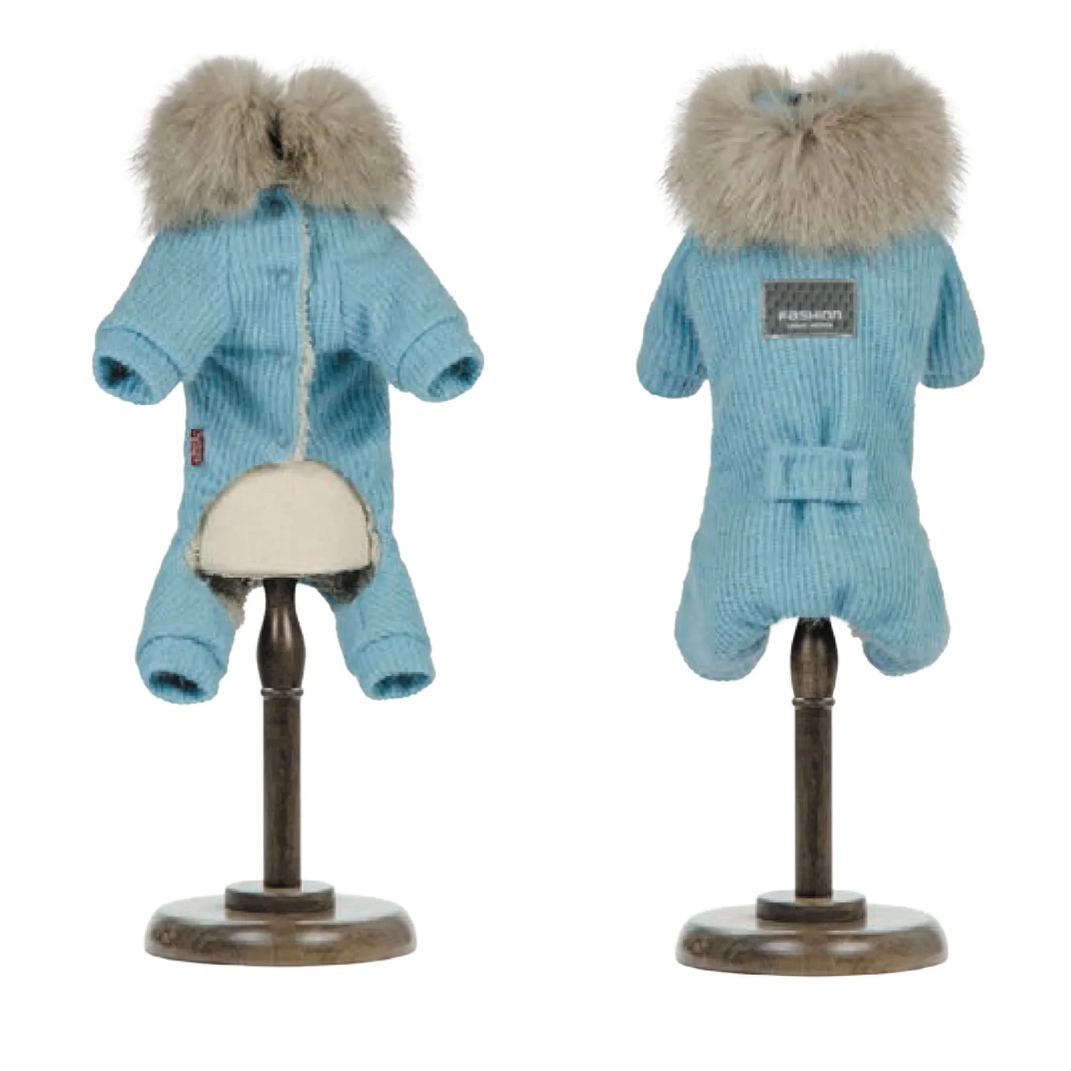 Bu rahat kombinezon süni xəz, dekorativ ləçək və arxa tərəfində yamaqla bəzədilib. Hündür yaxalıq təkcə boynu deyil, həm də başın bir hissəsini əhatə edir. Çoxfunksiyalıdır. Bərkitmə bərkidilir. Kombinezonun xarici hissəsi qalın toxunmuş parçadan, daxili hissəsi isə xəzlə astarlanıb.