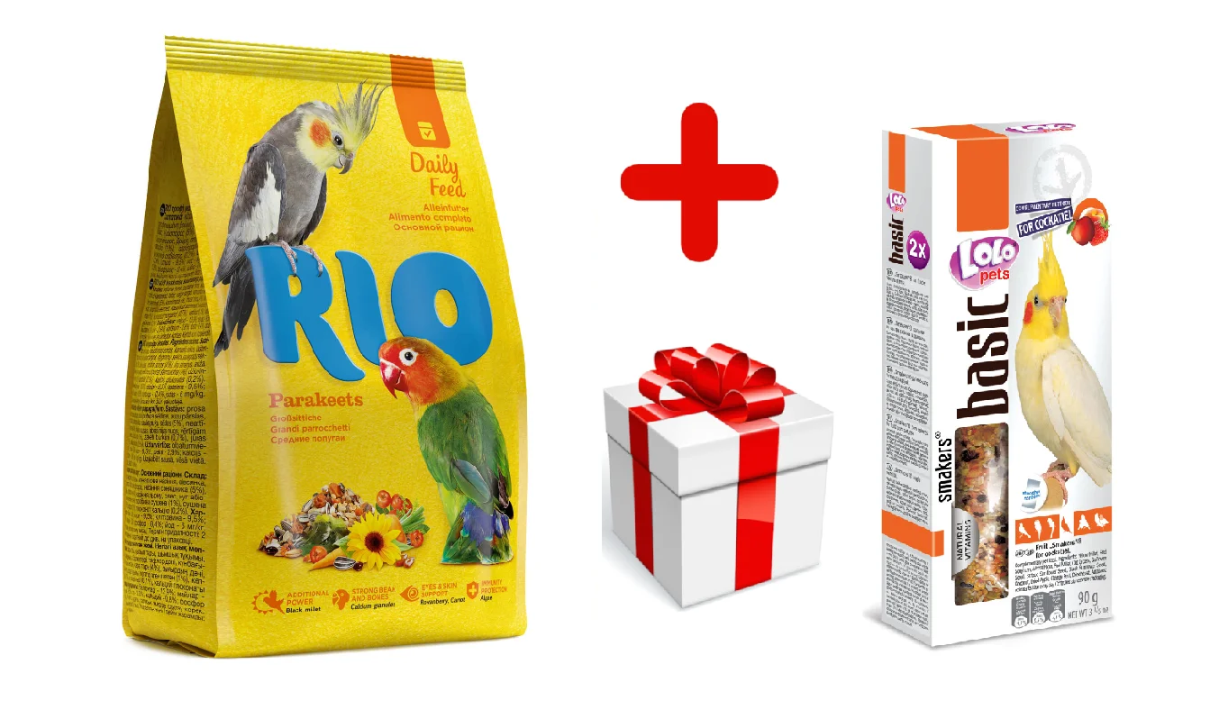 Orta ölçülü tutuquşular üçün RIO yemi, əsas pəhriz, 1 kq + Lolo Pets Smakers nimfalar üçün meyvə hədiyyəsi, 2 ədəd, 90 q