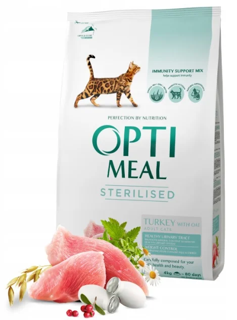 Hindistancevizi və yulaf ezmesi ilə sterilizasiya edilmiş pişiklər üçün optimal quru yem (4 kq torba)