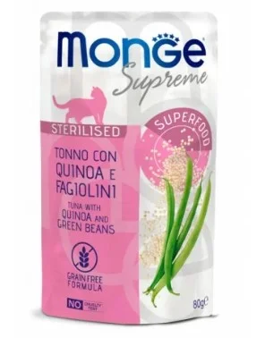 Monge Supreme Cat Sterilizasiya olunmuş və sterilizasiya olunmuş yetkin pişiklər üçün tuna, kinoa və yaşıl lobya ilə sterilizasiya olunmuş yaş yem, 80 q