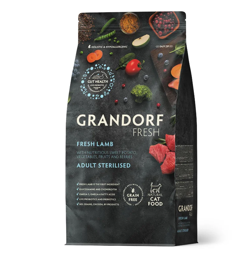 Grandorf Fresh Cat Sterilised Lamb Sweet Potato сухой беззерновой корм с живыми пробиотиками для взрослых стерилизованных кошек с ягненком, 2 кг