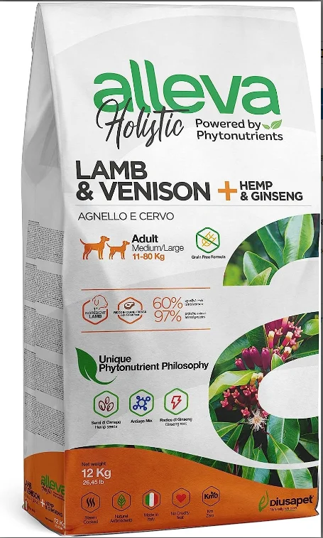 Alleva Holistic Adult Lamb & Venision Medium/Maxi корм для взрослых собак средних и крупных пород с ягненком, олениной, коноплей и женьшенем (целый мешок 14 кг)